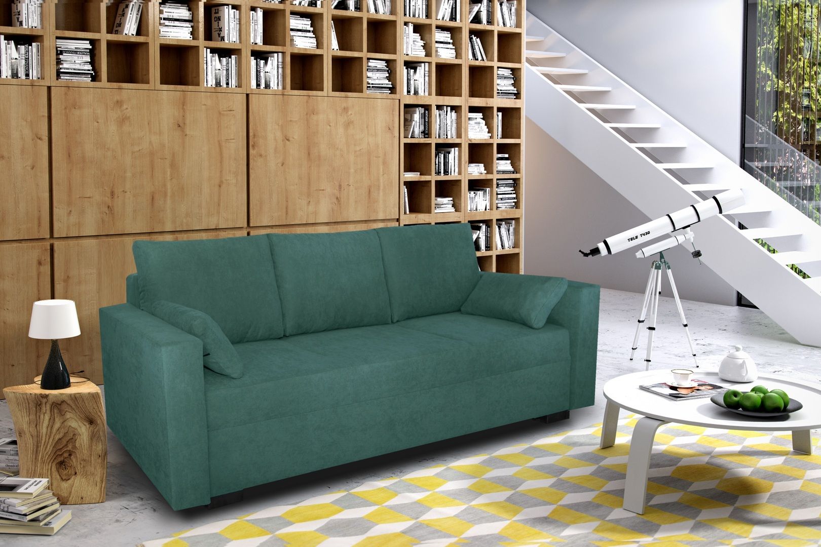 Раскладной диван обшит шикарной тканью сине-зеленого цвета. Ткань очень прочная, приятная на ощупь и как бонус легкая в уходе.