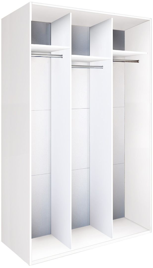Шкаф оснащен тремя полками и тремя штангами для вешалок. Прямой шкаф-купе имеет 3 зеркальные двери, что создаст в помещении эффект большого пространства.