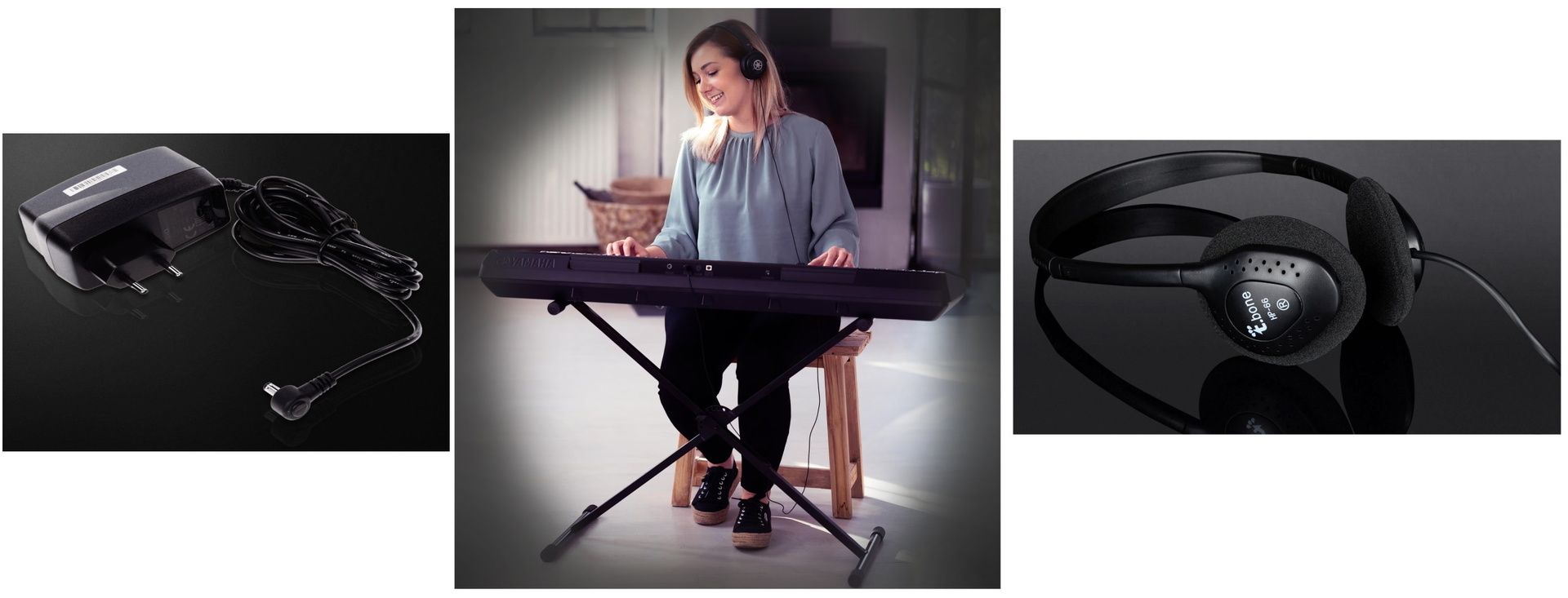 Suportul Millenium KS-1001 are un design în formă de X, fabricat din oțel durabil. Înălțimea acestui model este reglabilă, iar vârfurile din cauciuc sunt prevăzute pentru rezistență și stabilitate. Căștile T.bone HP 66 cu design acustic închis, funcționează într-o gamă largă de frecvențe de la 20 la 20.000 Hz. Bentita subțire din plastic este aproape imperceptibilă pe cap. Adaptorul de curent alternativ original Casio AD-E95100 pentru instrumente cu claviatură este proiectat pentru funcționarea la o sursă de alimentare standard de 220 V. Acesta se caracterizează prin fiabilitate și durabilitate și asigură funcționarea stabilă și sigură a instrumentelor muzicale.