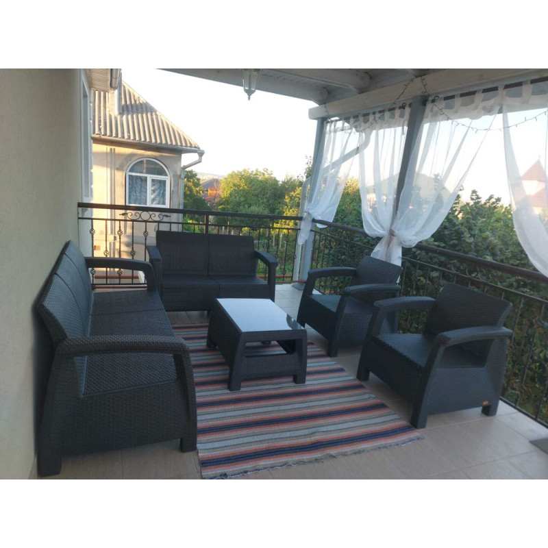 Culoarea antracit aduce o notă sobră și se potrivește cu diverse stiluri de amenajare, contribuind la crearea unei atmosfere relaxante și armonioase în aer liber. Setul este completat armonios de perne comode, sporind gradul de confort. Configurația compusă din masă, canapele de 3 și 2 locuri, precum și două fotolii, permite acomodarea unei companii de până la 7 prieteni, facilitând petrecerea timpului împreună în condiții confortabile.