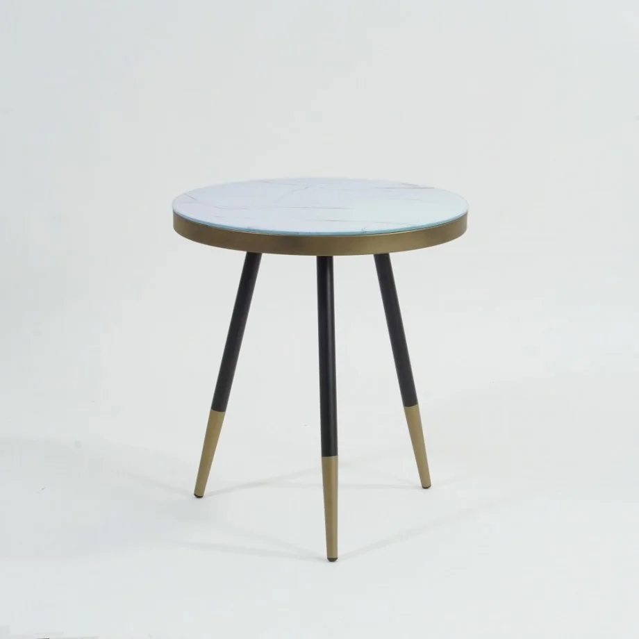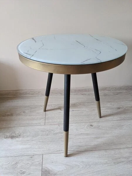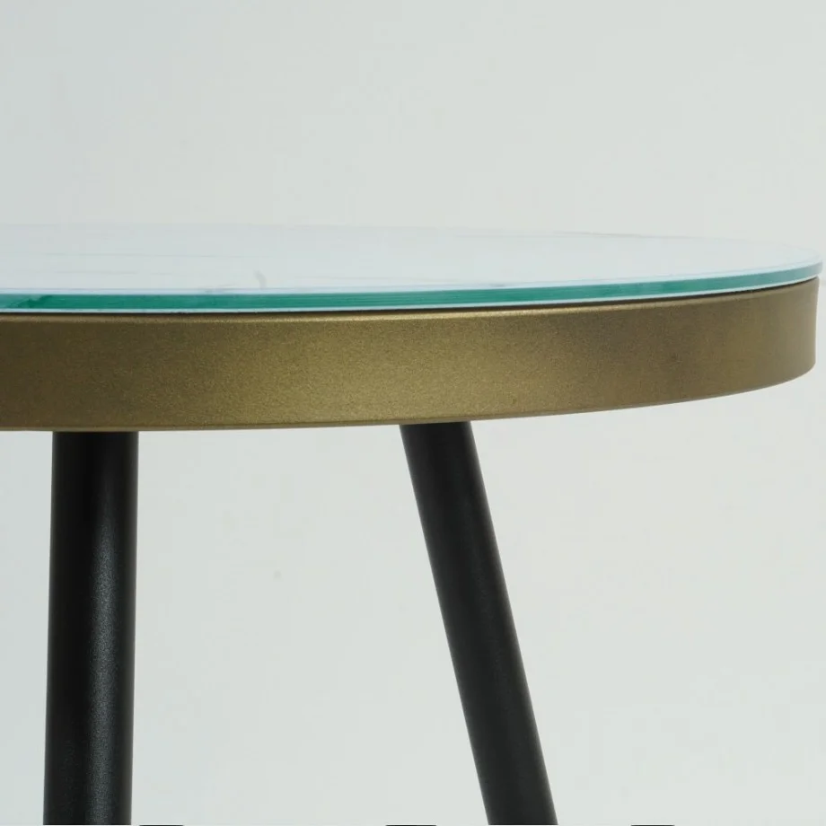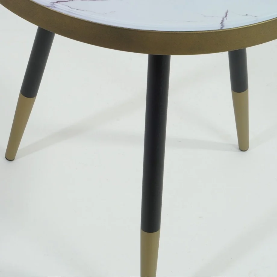 Această măsuță de cafea este rotundă, blatul este realizat din furnir de marmură, iar cadrul este format din picioare metalice drepte de culoare neagră cu vârfuri aurii.