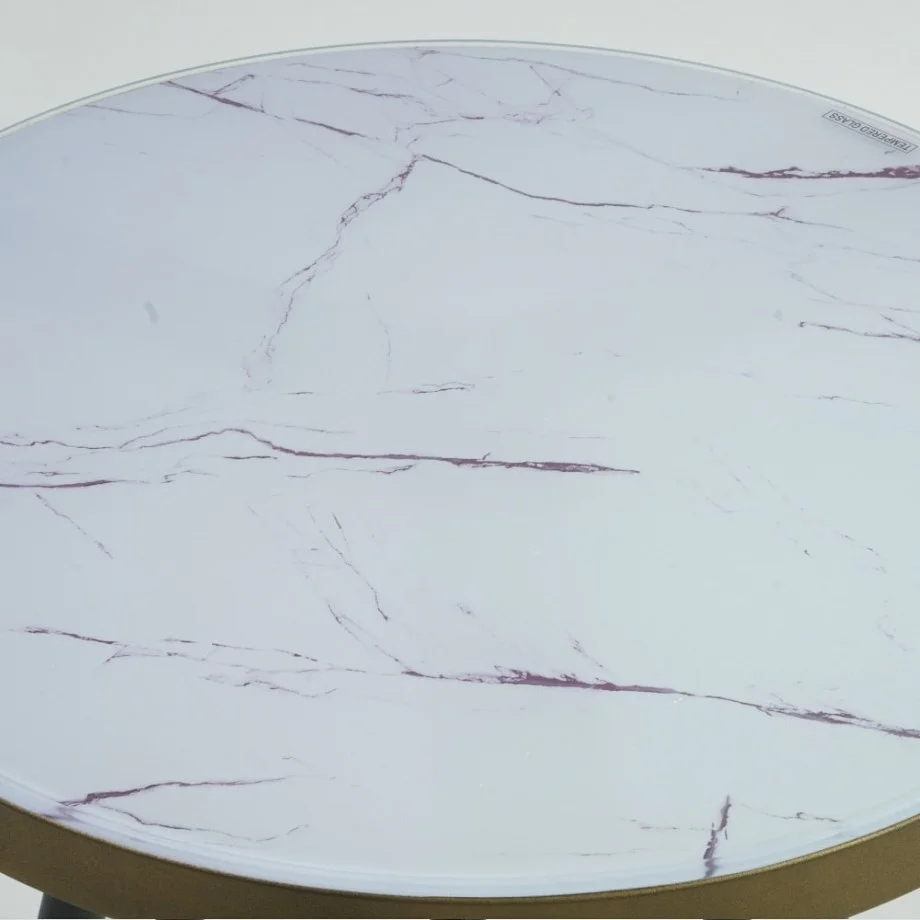 Placa circulară din sticlă cu efect de marmură, cu diametrul de 45 de centimetri, este încadrată de o ramă metalică elegantă de culoare aurie.