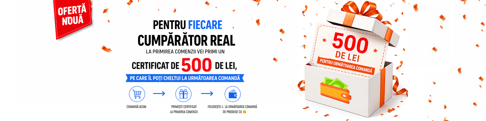 Comenzi multiple: În cazul în care o comandă conține mai multe produse marcate ca fiind eligibile pentru campanie, clientul poate utiliza câte un certificat separat pentru fiecare dintre acestea, respectând regula: 1 produs = maximum 1 certificat.
