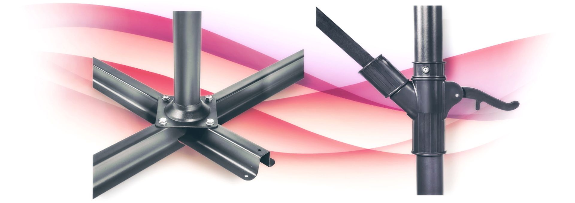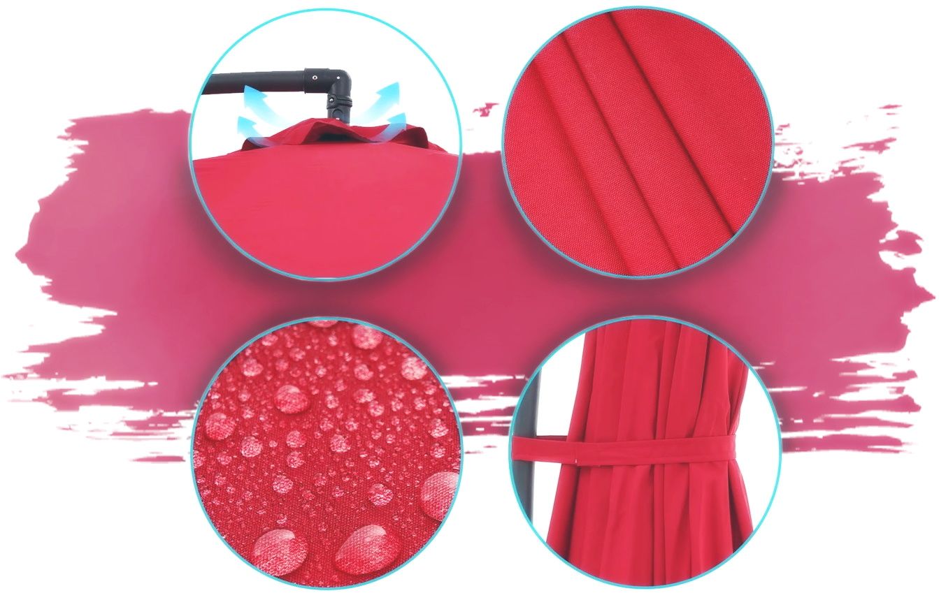 Umbrela UM002R - cu țesătură impermeabilă Oxford, va proteja nu numai de razele UV dăunătoare, ci și de ploaie. Procesul de montare a copertinei pe cadru, cu ajutorul unor elemente de fixare speciale, durează câteva minute și nu necesită abilități sau instrumente speciale.